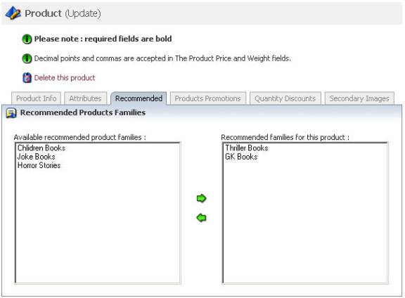 2. In the Product (Insert) or Product (Update) page, click Recommended tab to open Product Families page.